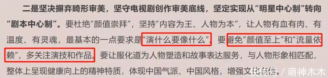 会议第二点就是强调坚决摒弃畸形审美,坚守电视剧创作审美底线,坚定实现从“明星中心制”转向“剧本中心制”。明确提出杜绝“颜值崇拜”,坚持“内容为王,人物为本”,对演员出身没有限制,但最基本的要求是“演什么要像什么”。