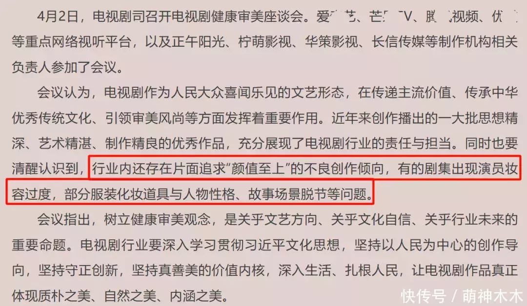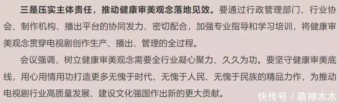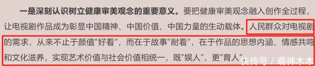 会议上第一点就提出要深刻认识树立健康审美观念的重要意义,观众对电视剧的需求从来不止在于表面的颜值,一部剧想出圈,想大爆,最重要的还是故事耐看。
